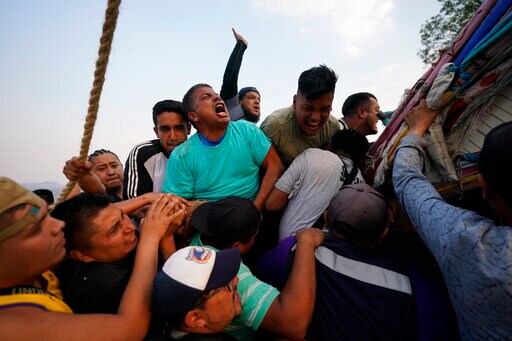 SANTA CRUZ XOCHITEPEC (AP) — Dozens of men strained and struggled as they hefted a huge cross adorned with colorful ribbons and trudged down a steep hill in a yearly ceremony of the Day of the Cross celebrated in the Mexico City neighborhood of Santa Cruz Xochitepec.