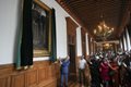 Outside the National Palace, hundreds of boisterous supporters of the folksy populist showered him with love while mariachis gave a brassy serenade.