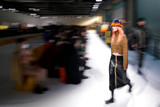 The combined men’s and women’s collection for next fall and winter that was shown Monday uses high-end materials — including upcycled sheepskin treated and colored — for vibrant jackets and trousers with a sexy sheen, recycled nylon for quilted garments and feathers for puffer jackets. It also uses technical wool for knitwear partially sourced from top producer Loro Piana.
