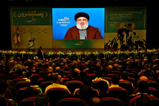 His speech was broadcast on a large screen to supporters in Beirut's southern district.
