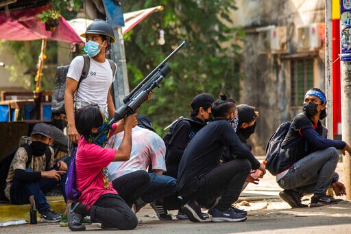 Security forces continued to spread fear among ordinary citizens. Overnight, a resident of Yangon recorded video of a group of soldiers and police using sling shots to fire stones at the windows of homes, breaking the night's silence. At other times, soldiers and police keep up their intimidation at night with raids on neighborhoods, during which they shout abuse, shoot at random, make arrests and vandalize property.