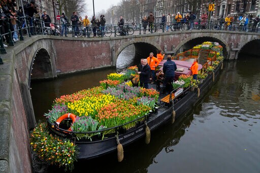 National Tulip Day is usually marked by an improvised flower garden in front of the royal palace on the capital's central Dam Square. But with pandemic lockdown measures continuing to restrict large public gatherings, organizers this year took to Amsterdam's World Heritage-listed canals to hand out their flowers.