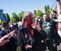 The protesters carried Ukrainian flags and chanted "fascist" at him, while some were dressed in white sheets smeared with blood, symbolizing the Ukrainian victims of Russia's war. Other men in his entourage were also seen splattered with what appeared to be red paint.