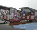 Police and firefighters' cars and trucks stand in front of the VIVO! shopping mall where a 27-year-old man attacked people with a knife killing one person and injuring several others in Stalowa Wola, southeastern Poland, on Friday, Oct. 20, 2017. (AP Photo/Rafal Baran)