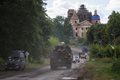 The report showed burnt-out Russian military columns on roads in the area as well as Ukrainian soldiers handing humanitarian aid to local residents and taking down Russian flags from an administrative building.