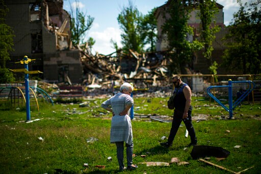BAKHMUT, Ukraine (AP) — Chunks of thick, twisted metal and wood splinters lie among the swings and slides in the playground outside a bombed-out school. Some streets away, a yellow bathtub dangles over the void left when part of an apartment building collapsed in a bombing.