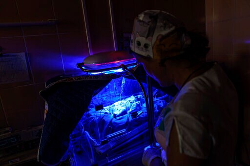 Born nearly two months prematurely weighing 1.5 kilograms (3 pounds, 4 ounces), the infant receives oxygen through a nasal tube to help her breathe while ultraviolet lamps inside an incubator treat her jaundice.