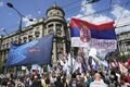 In Belgrade, union flags mixed with student banners outside the Serbian government building in a downtown area as thousands streamed in from various parts of the city for the gathering.