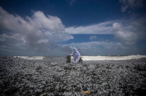 Debris — including several tons of plastic pellets used to make plastic bags — from the burning ship has washed ashore and is causing severe pollution on beaches. The government has banned fishing along about 80 kilometers (50 miles) of the coast.