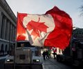 A Canadian flag flies upside down on the back of a truck during a "Freedom Convoy" protesting against COVID-19 vaccine mandates and restrictions in front of the Parliament of Canada in Ottawa, January 28, 2022. (Getty Images)