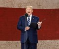 Trump joined in giving a standing ovation to a group of World War II vets who appeared on stage as the commemoration began.