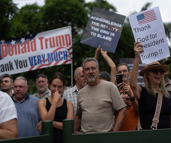 Hundreds of protesters held placards that read “Thank God for President Trump” and displayed other messages criticizing what they see as racist laws instituted by the South African government that discriminate against the white minority.