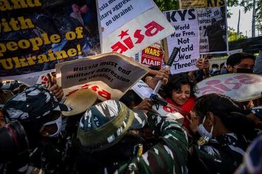 As the fighting continued in Ukraine, several organizations held protests in the Indian capital for a second day Saturday, demanding an end to the Russian aggression and pressing the Indian government to evacuate thousands of Indians, mostly students, stranded there.
