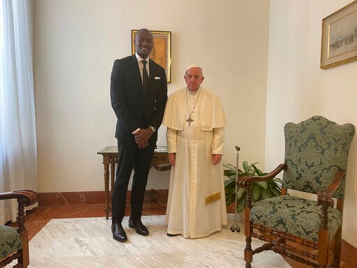VATICAN CITY (AP) — Pope Francis may have canceled his planned trip to Congo because of his bad knee, but he had a visit Tuesday from one of Congo’s brightest basketball stars who briefed him on his humanitarian efforts back home.