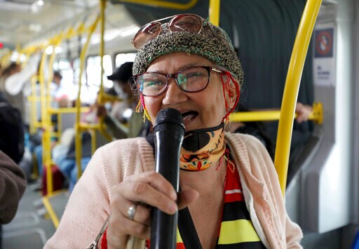 BOGOTA, Colombia (AP) — With her pink cardigan and thick glasses, “Toothless Cindy” is becoming a musical sensation on Colombian public transport.